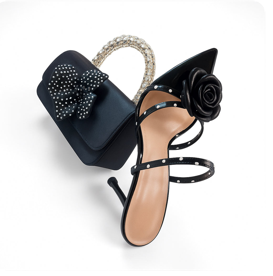 Black roses meet bold studs in this sleek duo. A statement in elegance and edge made to turn heads, day or night.